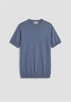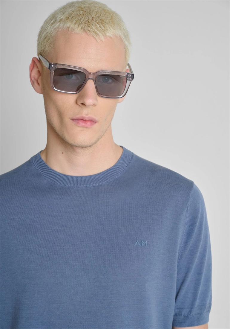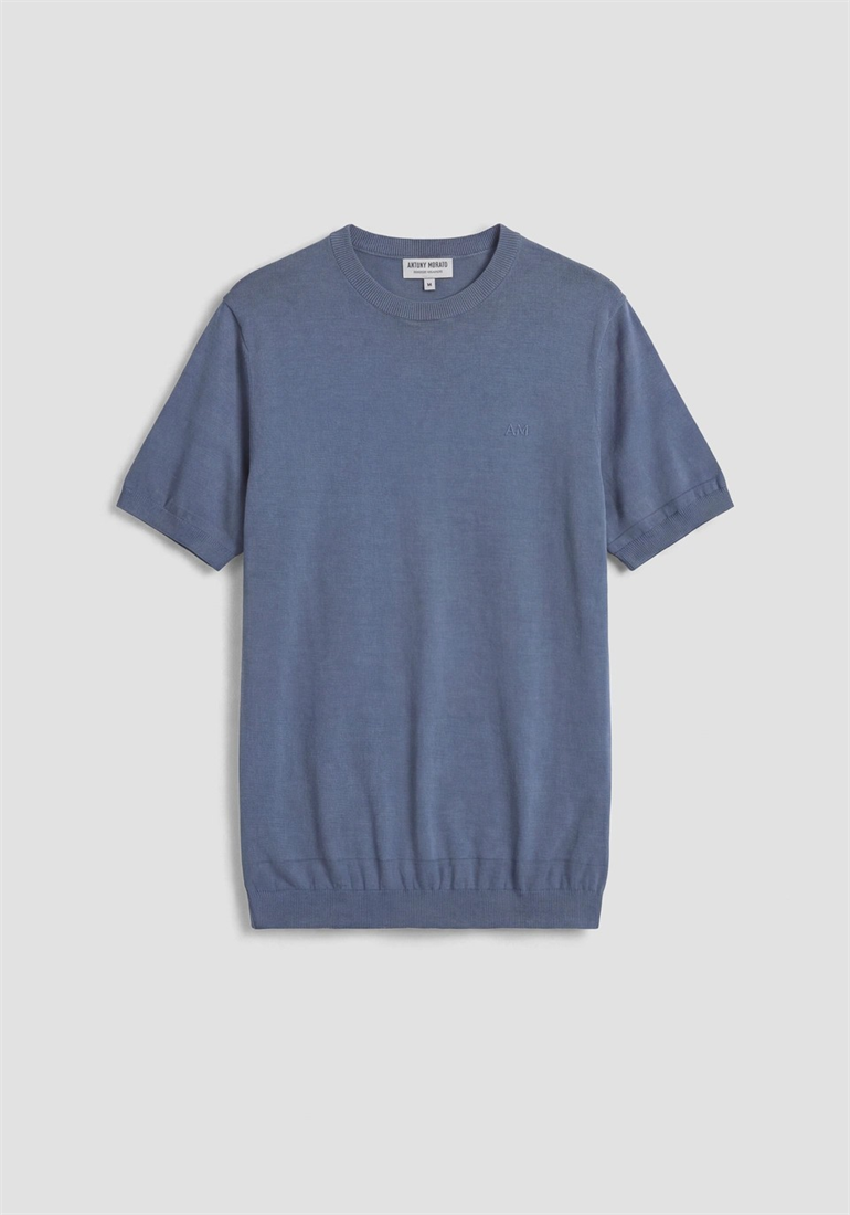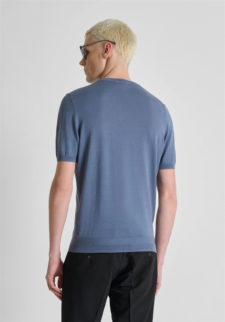 Este jersey de cuello redondo y manga corta, confeccionado en suave tejido de mezcla de algodón de color azul China, presenta una inspiración minimalista. Con su corte regular, es la prenda ideal para acompañarte en tu tiempo libre, fácilmente combinable con los diferentes «looks» «off duty». Completan el jersey el logotipo bordado en el lado del corazón y el punto acanalado en el cuello, el bajo y las mangas.